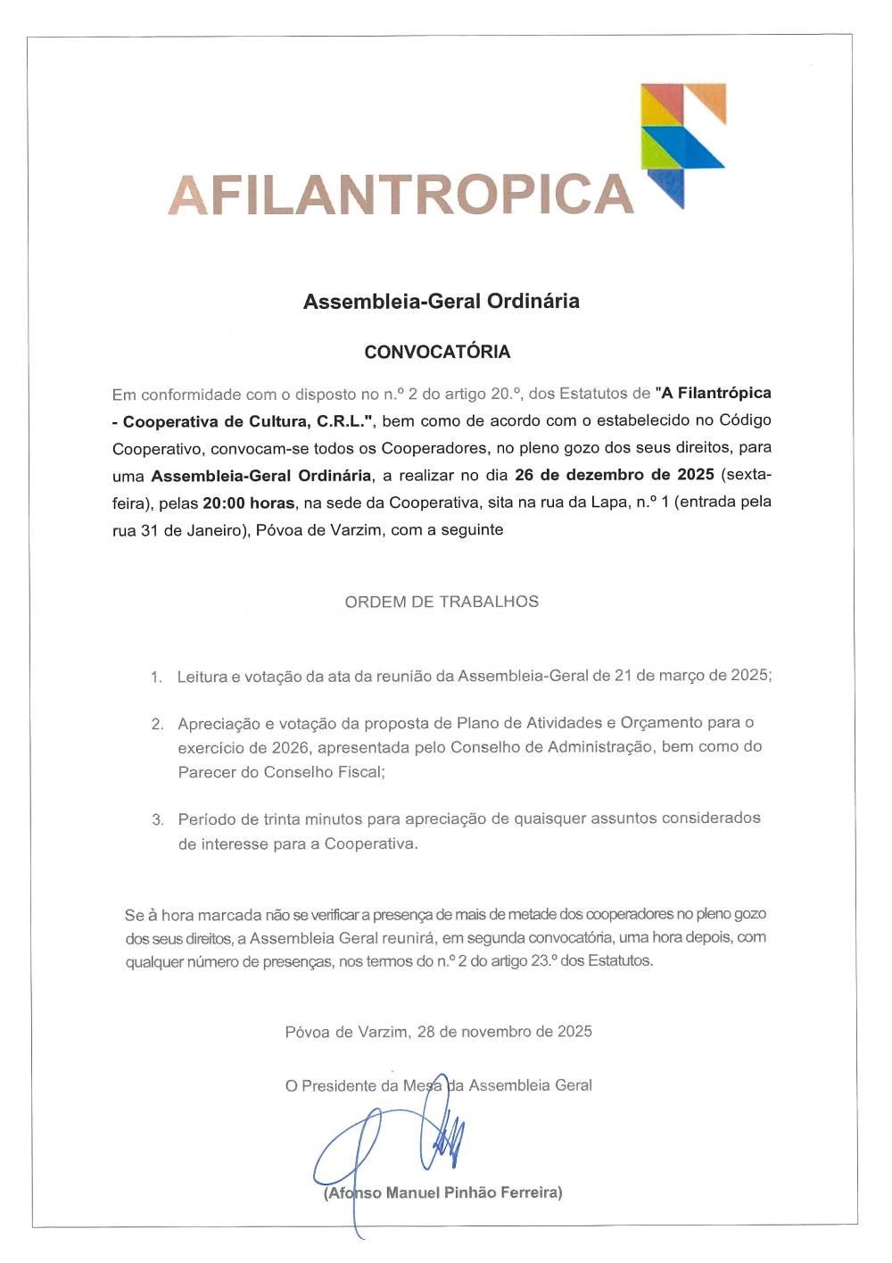 Em conformidade com o disposto no nº 2 do artigo 20.º, dos Estatutos de “A Filantrópica – Cooperativa de Cultura, C.R.L.”, bem como de acordo com o estabelecido no Código Cooperativo, convocam-se todos os Cooperadores, no pleno gozo dos seus direitos, para uma Assembleia-Geral Ordinária, a realizar no dia 26 de dezembro de 2025 (sexta feira), pelas 20:00 horas, na sede da Cooperativa, sita na rua da Lapa, n.º 1 (entrada pela rua 31 de Janeiro), Póvoa de Varzim, com a seguinte